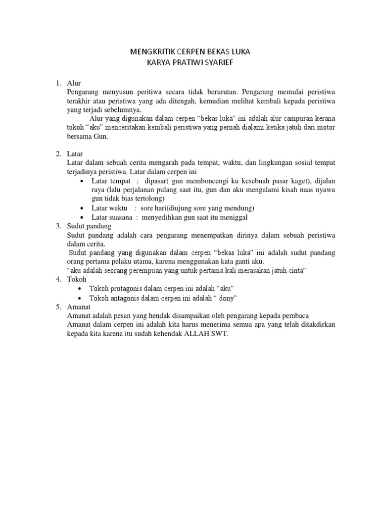 Bekas galian lubang tempat telur penyu diletakkan, yang telah diambil para. Karya sastra yang saya kritik adalah cerpen yang berjudul bekas luka yang diambil dari sebuah antologi cerpen karya pratiwi syarif. Lalu kapan bekas luka akan bisa hilang? Dalam beberapa kasus, bekas luka dapat menyebabkan masalah yang lebih serius, seperti membatasi gerakan. Cermati kutipan teks cerpen berikut !