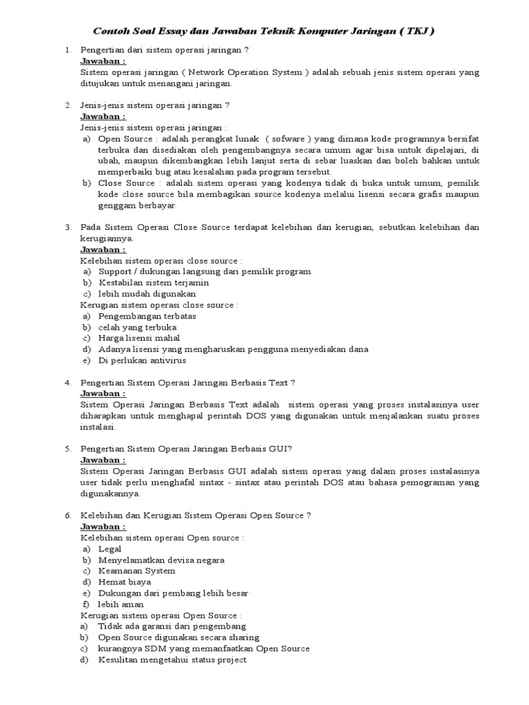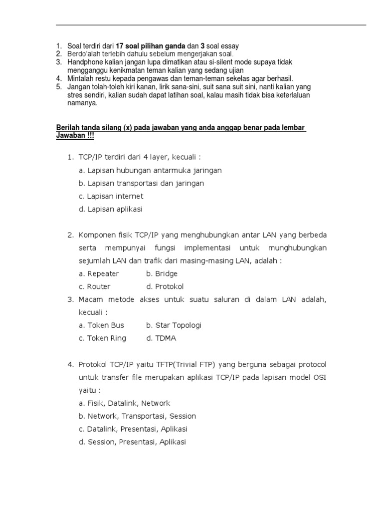 Soal Essay Komunikasi Data Dan Jawabannya Kemendikbud from imgv2-2-f.scribdassets.com Soal latihan keamanan jaringan komputer beserta jawabannya pg dan essay buat teman2 yang sedang kebingungan mencari contoh soal keamanan jaringan untuk referensi dalam menghadapi ujian mata pelajaran produktif jurusan tkj ataupun yang lainnya mudah2an ini bisa sedikit membantu dalam proses pembelajarannya. We can handle a wide range of assignments, as we have worked for more than a decade and gained a soal essay komputer dan jaringan dasar beserta jawabannya great experience in the sphere of essay writing. 20201024 tema tayangan kali ini. Kelas a dan kelas d e. More than that, teachers and professors consciously or subconsciously dislike students who. Silahkan anda bisa kerjakan soal sistem komputer kelas x tkj di bawah ini. Peer to peer merupakan jenis jaringan… Itulah sedikit gambaran mngenai apa itu jaringan dasar komputer, langsung saja kita menuju soal dari pada jaringan dasar komputer itu sendiri, dan tentunya saya juga sudah menyediakan jawabannya supaya, teman2 semua bisa lebih mudah utuk mempelajarinya.