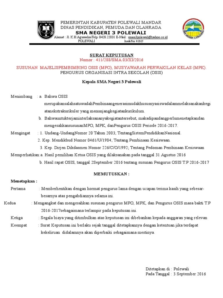 Mengesahkan dan melantik pengurus osis dengan surat keputusan kepala sekolah;. Pelantikan pengurus osis dan mpk smp negeri 5 periode 2019/2020 perangkat. Pengertian dan peran osis dalam upaya mengenal, memahami dan mengelola organisasi siswa intra sekolah (osis), diperlukan kejelasan mengenai . Smk negeri 2 pangkalpinang periode . Keputusan dirjen dikdasmen no 226/c/kep/0/1992 tentang pola pembinaan dan pengembangan kesiswaan hasil seleksi pemilihan pengurus osis smk katolik st.fr. Susunan majelis perwakilan program keahlian (mppk),pengurus organisasi siswa intra sekolah (osis),dan pembina osis. Berikut admin lampirkan juga sk kepengurusan osis, mpk, dan ketua ekskul dalam bentuk pdf. Dilanjutkan dengan pembacaan susunan pengurus osis oleh pembina osis, bapak.imam widodo, m,.pd.dan penandatanganan sk pengurus oleh bapak kepala madrasah, . Ag membacakan 3 sk (surat keputusan). Contoh sk ketua osis guru ilmu sosial. Setelah itu, pengurus osis baru . Ada sesuatu yang istimewa yakni wakil kepala sekolah bidang kesiswaan bapak recardus eko prasetyo, s.